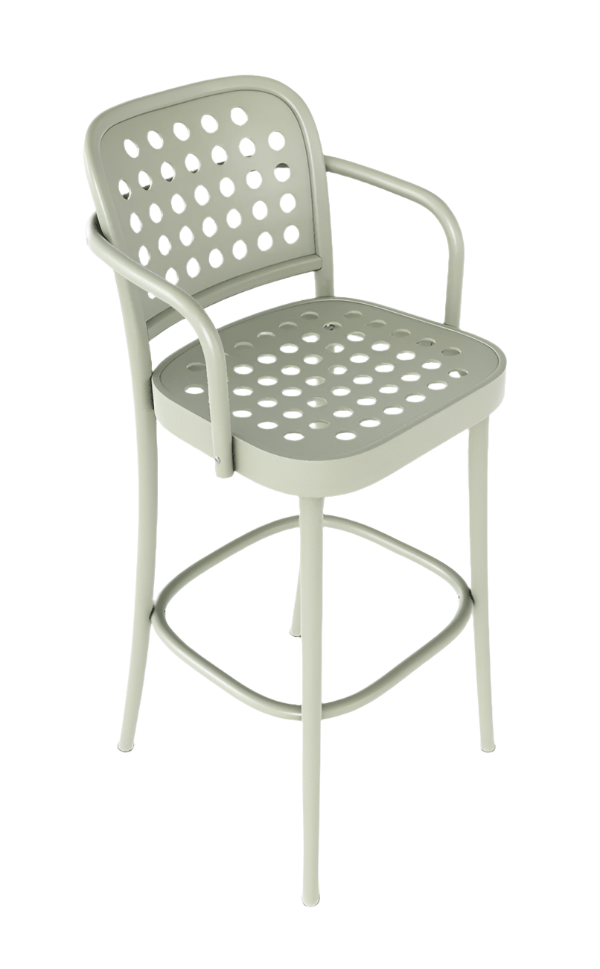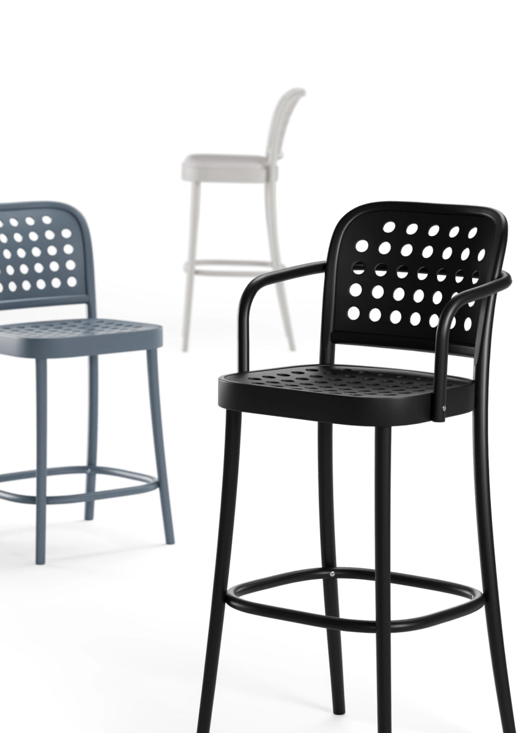Materials: Bentwood barstool with arms. Frame in solid natural beechwood or beechwood with stain or lacquer finish. Seat in wood veneer or upholstered with fabric or leather.